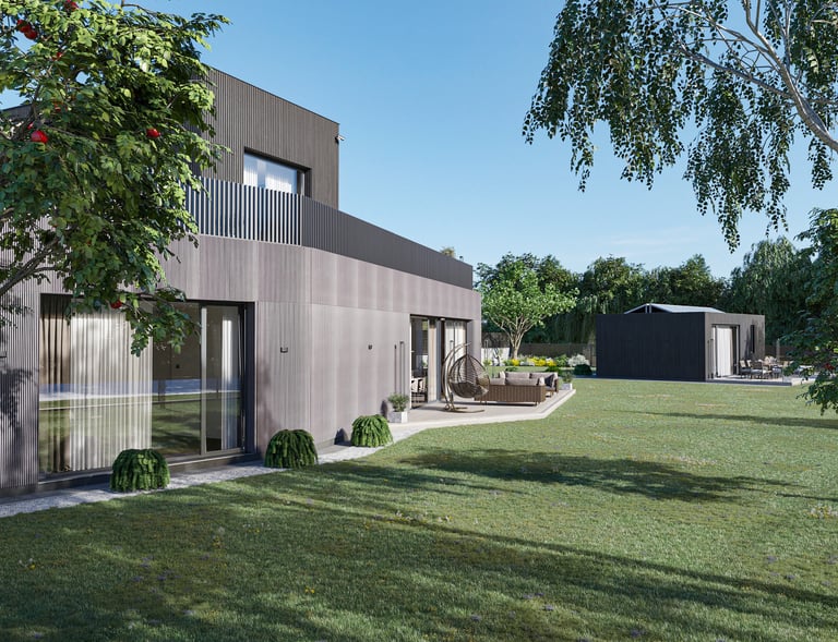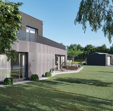 Dviejų aukštų, 230 m² namo eksterjeras.